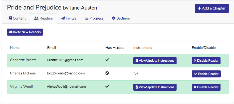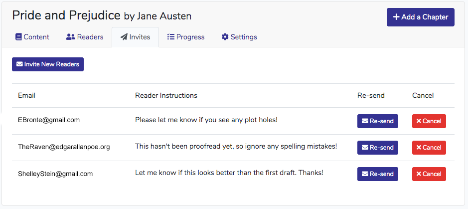 You can invite new readers with a click of the "Invite New Readers" button! We made it easy for you to invite multiple readers at once, with a personal message and specific instructions of what kind of feedback you're looking for. Each reader will then get an email from us, with a unique sharing link (that expires within 24 hours and can only be used once) they can use to access your book.